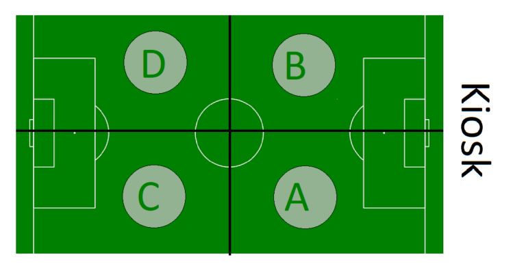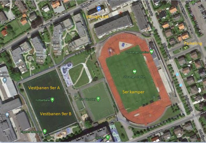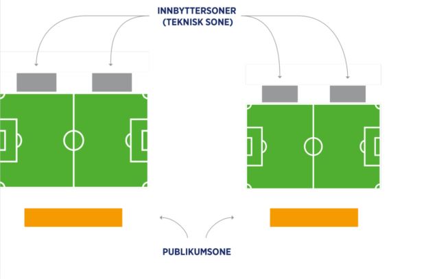 9er kamper: halve vestbanen, sørg for 2 meter klaring mellom innbyttesone på bane A og innbyttesone på bane B. Teknisk sone mellom banene. Kiellandsmyra kan også brukes